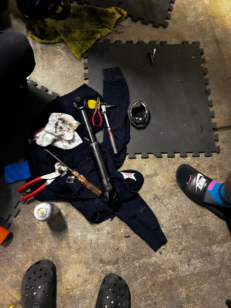 Everything was going well until the final drive wouldn’t release from the shaft. I could see there was some light rust (common on these bikes). I couldn’t get it to separate and was about to go HAM on it. Also, keep in mind it was 100 degrees out and the garage AC only does so much