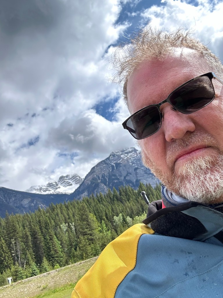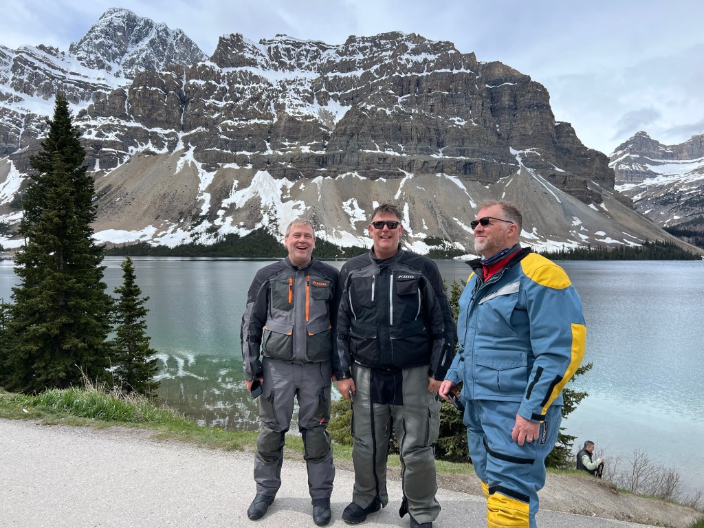 The first hour out of Calgary was primary slab and across the Expressway. Then we entered the park after paying a nominal fee and enjoyed the views of the mountains. It is gorgeous. In order to get our final destination, we turned onto a road called ice field Parkway now in June you think not much ice but you can see a lot of snow on the mountain top, but it was chilly but not uncomfortable. There’s a big butt here, but we had to cross the mountains to get to our destination on the other side. The mountain pass was only like 7200 feet maybe but once we started gaining altitude, we hit fog and then we hit snow and for most of an hour. It snowed on us. A combination of sleet and snow hands went numb. It was a small sheet of ice on my visor. The road was actually pretty busy and it was a little on white knucklie. Ultimately the cold-weather riding gear did his job kept us from frostbite. The bikes handled great. Traffic was respectful of us going slower at times and try not to run us over. It was an interesting route. We can say we’ve been there, but we won’t likely return anytime soon.