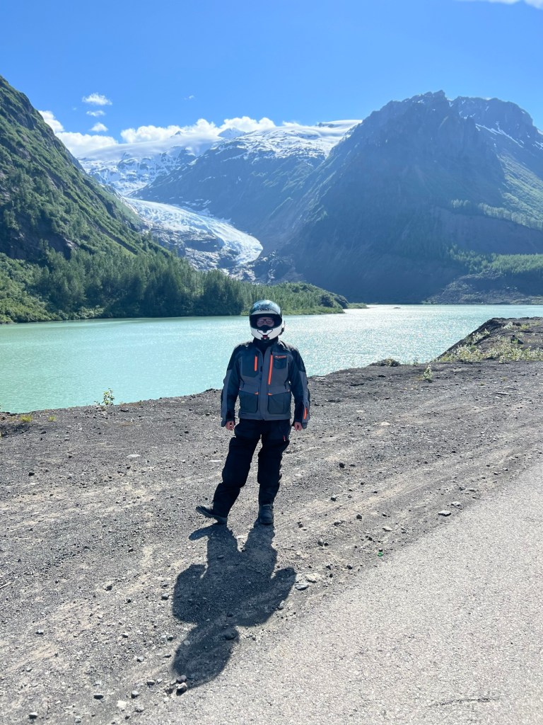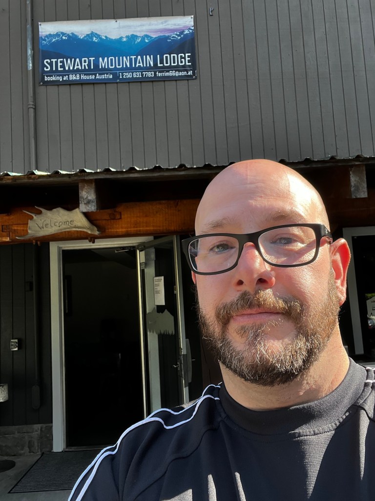 The next segment was the Cassier Highway. In 2010 when I was there it was pouring rain, so I had no idea what it really looked like. It was tree lined most of the way but large snow covered mountains appear on a the horizon. We got into some deep chats on this section and then we hit the junction of 37A after a few hours. Again a quick top off of gas so we didn’t have to rely on the one station in Stewart happened and we headed to Stewart/Hyder AK.