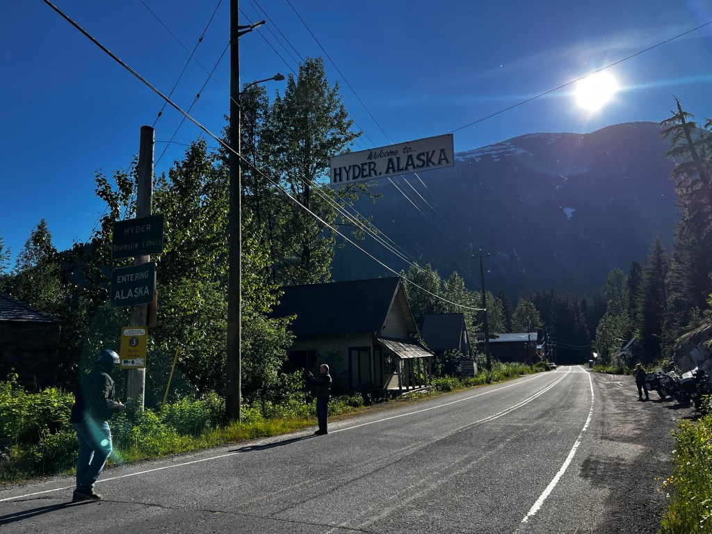 As we got off the bikes we decided to unpack and go to the Pizza place. We got there and it was locked up. The “gentlemen” that worked there was none to happy to tell us they had run out of pizza. So we had basically given up to eat my Oatmeal and Mac&Cheese that I carry for roadside meals. Before we did that, we all ate some hiking bars and decided to go to Hyder. On our way we saw the market was open and we got excited for better food options. So much when we got to Hyder we decided not to explore the vast shopping and tourist district, but to take some pictures and cross back into Canada. (That was sarcasm, Hyder doesn’t even have a store).