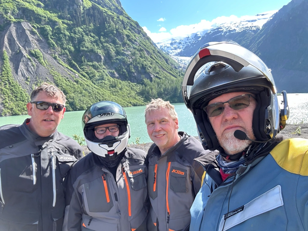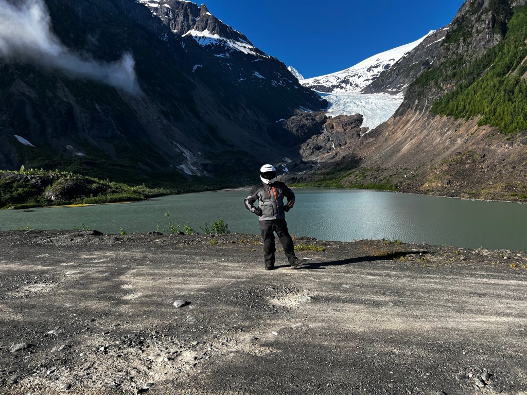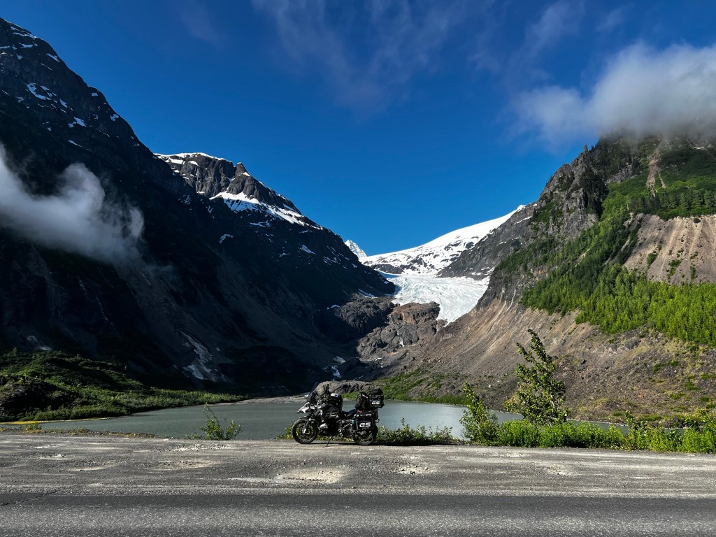 I caught up quickly as grampy was leading the way (they were riding slow waiting for me) 😀 then we got the great pleasure of seeing the mountains and Bear Glacier with the morning fog. So we got the Sunny experience on the way in and the eerie on the way out.