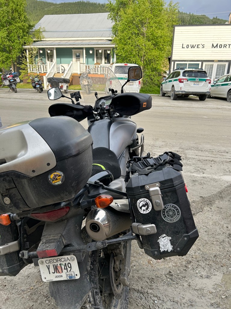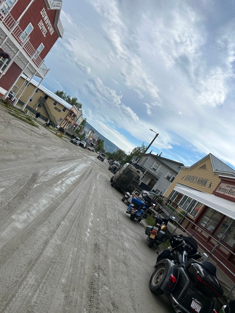 About two hours out, we ran into road construction. After sitting a few minutes, during which we filtered to the front of the line, the pilot truck arrived and we took off. Except we didn’t TAKE OFF, we meandered for almost 30 minutes through the dirt, gravel and mud. Finally we came to the end and lit out again. The road was in decent shape and relatively vacant. We sealed smooth for a bit and then hit gravel. The gravel was deep, loose, dusty and covered the entire road. Not the road conditions one might want for the end of 13 hours on the road. While it seemed forever, it was only 20-25 minutes. We got passed by a couple of cars, the dust slowing us down more. It finally ended just in time for us to catch an evening shower. The last few clicks into Dawson City were uneventful.
