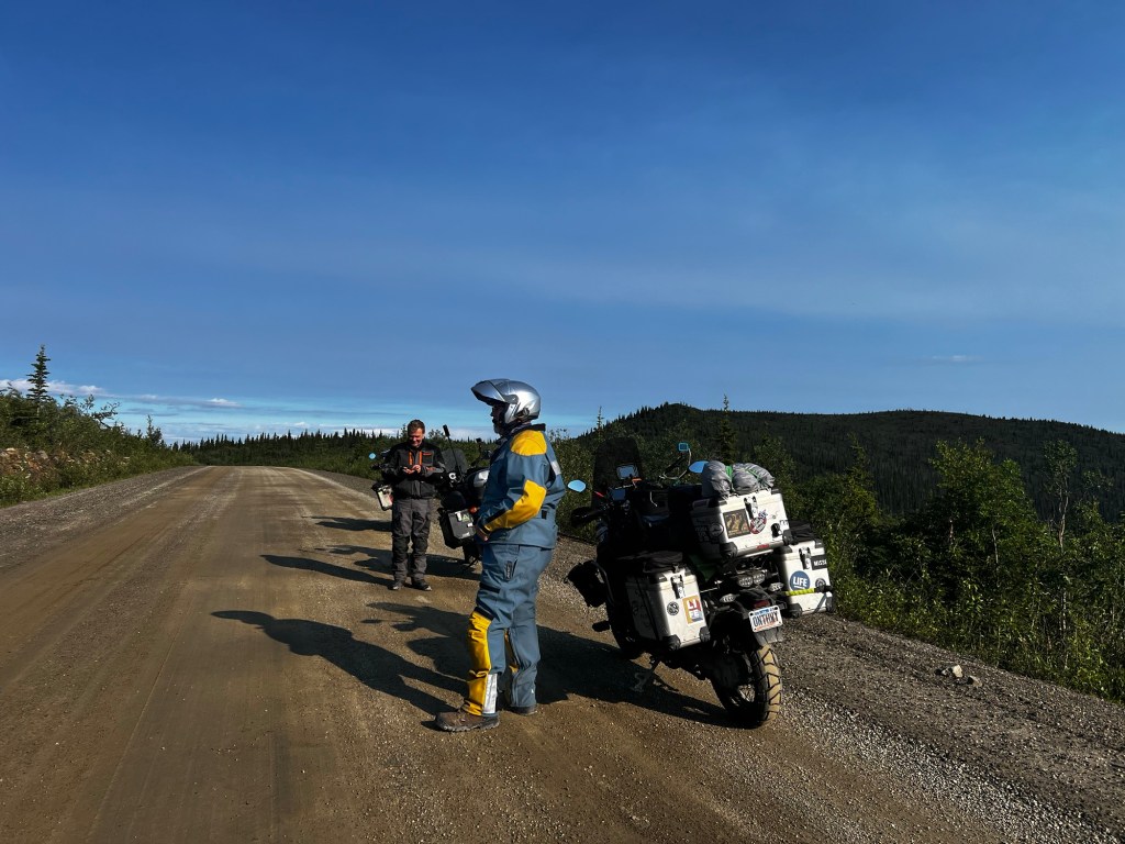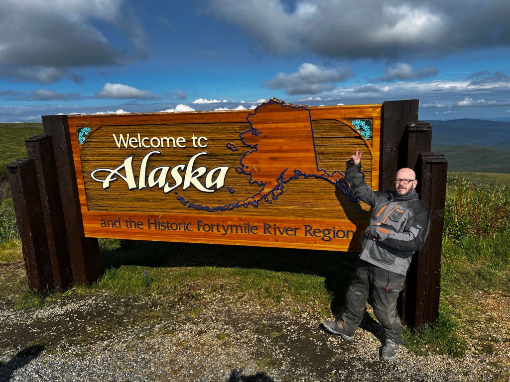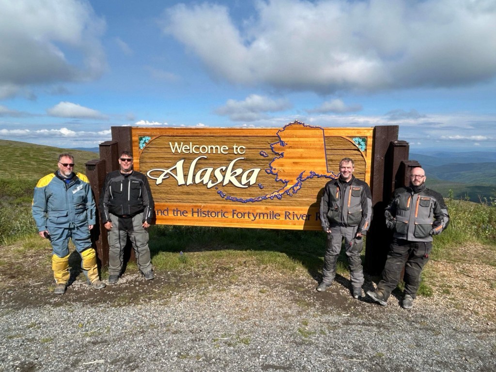 Eventually we got to the border crossing. There was a huge group of bikes in front of us, so it would take some time which wasn’t bad to just stand there for a bit. The border guard was in a good mood and was being really efficient. I asked if I could stop in the medium just after the checkpoint to put on my gloves. He told me sure, but I could put them on there. I told him I didn’t want to hold up the line and he smiled really big and said, “People have come thousands of miles to come and see me, they can wait another minute”. I wished him a good day and we proceeded to the Welcome to Alaska Sign.
