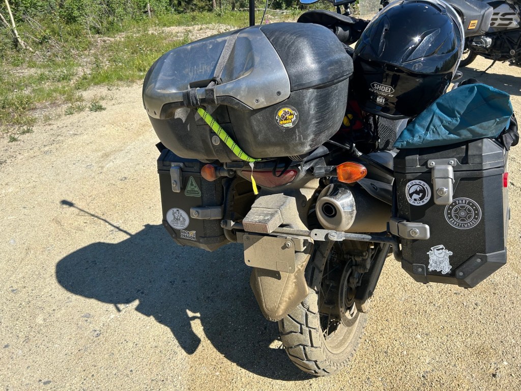 Despite the efforts to reduce dust, we were still breathing in dust everywhere. I stopped with Alf to get dust masks out of my top case, and managed to leave the top case open with my luggage keys in the lock cylinder. I only had a single luggage key that locksmiths can’t find a workable blank for, so I had ordered a new key from the only dealer that carries that luggage model in April. I still haven’t received the new key. You can probably guess – the keys fell out somewhere on the Dalton and we weren’t going to be able to find them. A Rok strap was use to hold the top case closed.